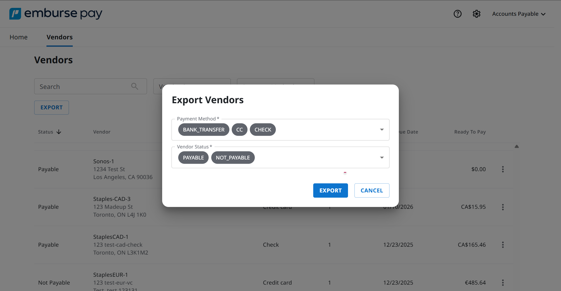In the Export Vendors dialog, select one or more Payment Method options: